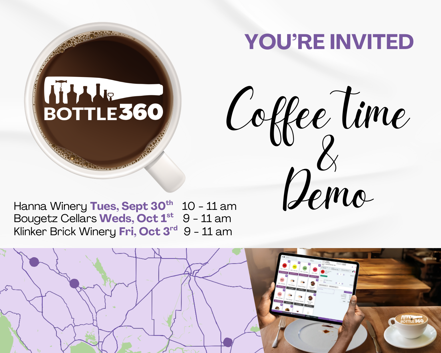 Join us for a live demo event with Bottle360 and learn how you can transform your winery’s Direct-to-Consumer sales while enjoying gourmet coffee and breakfast.