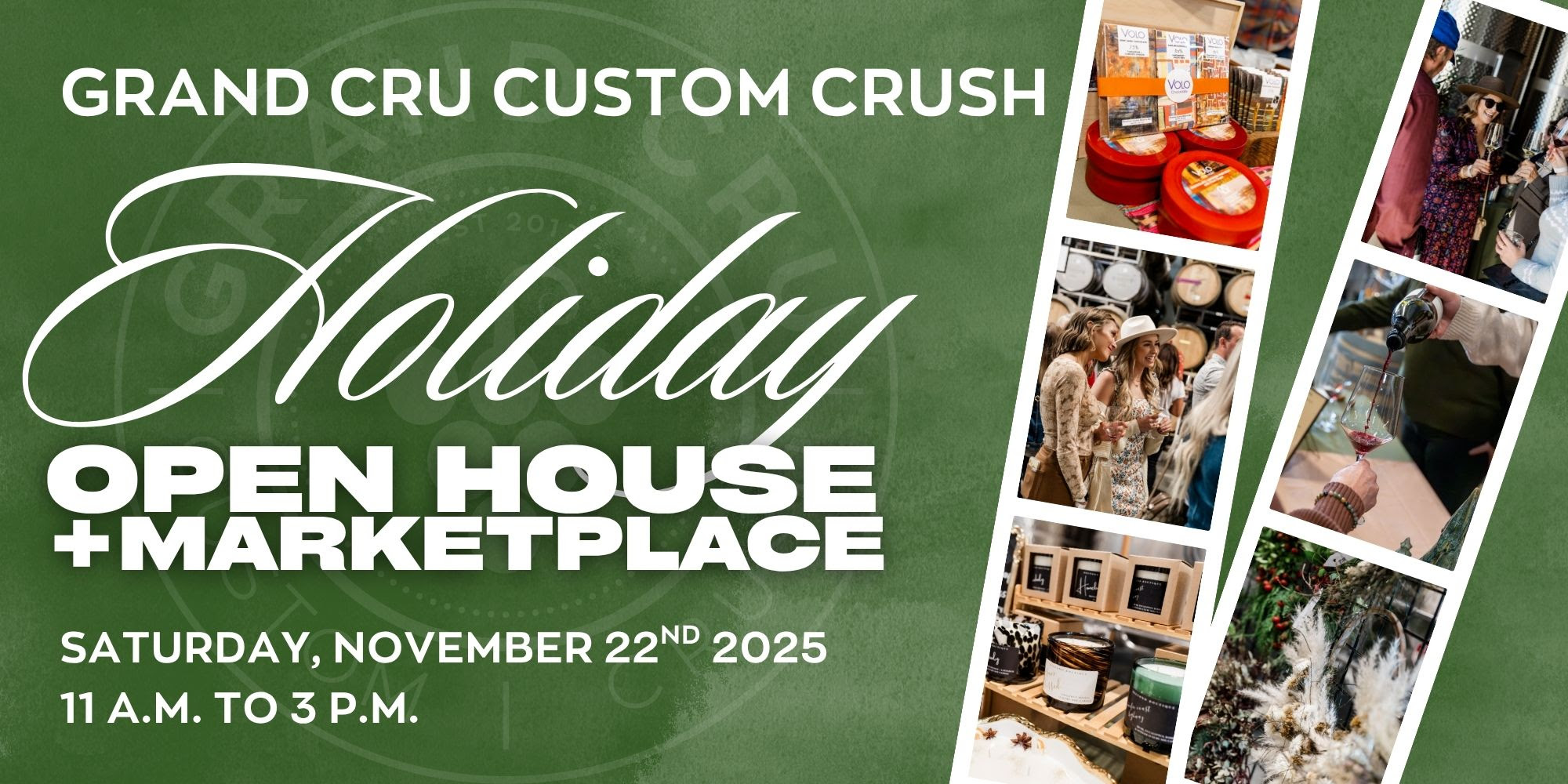 The holidays are coming up fast, and we’re so excited to invite you to our Holiday Open House + Marketplace on Saturday, November 22nd at Grand Cru Custom Crush!