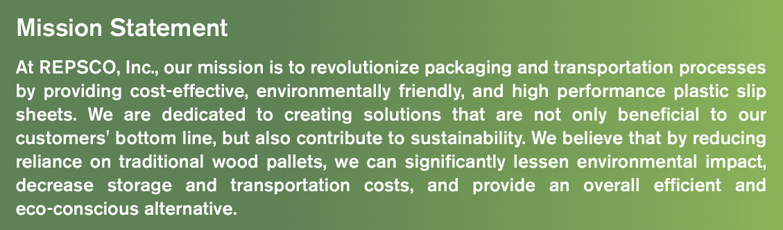 At REPSCO, Inc., our commitment to quality and customer satisfaction is paramount. We pride ourselves on being more than just manufacturers; we strive to be innovators, constantly seeking new horizons. Our products, particularly our eco-friendly slip sheets, reflect this dedication. They are designed not just to meet but to exceed industry standards, providing our customers with reliable, sustainable solutions. Join us as we continue to lead the way in blending economic benefits with ecological responsibility.