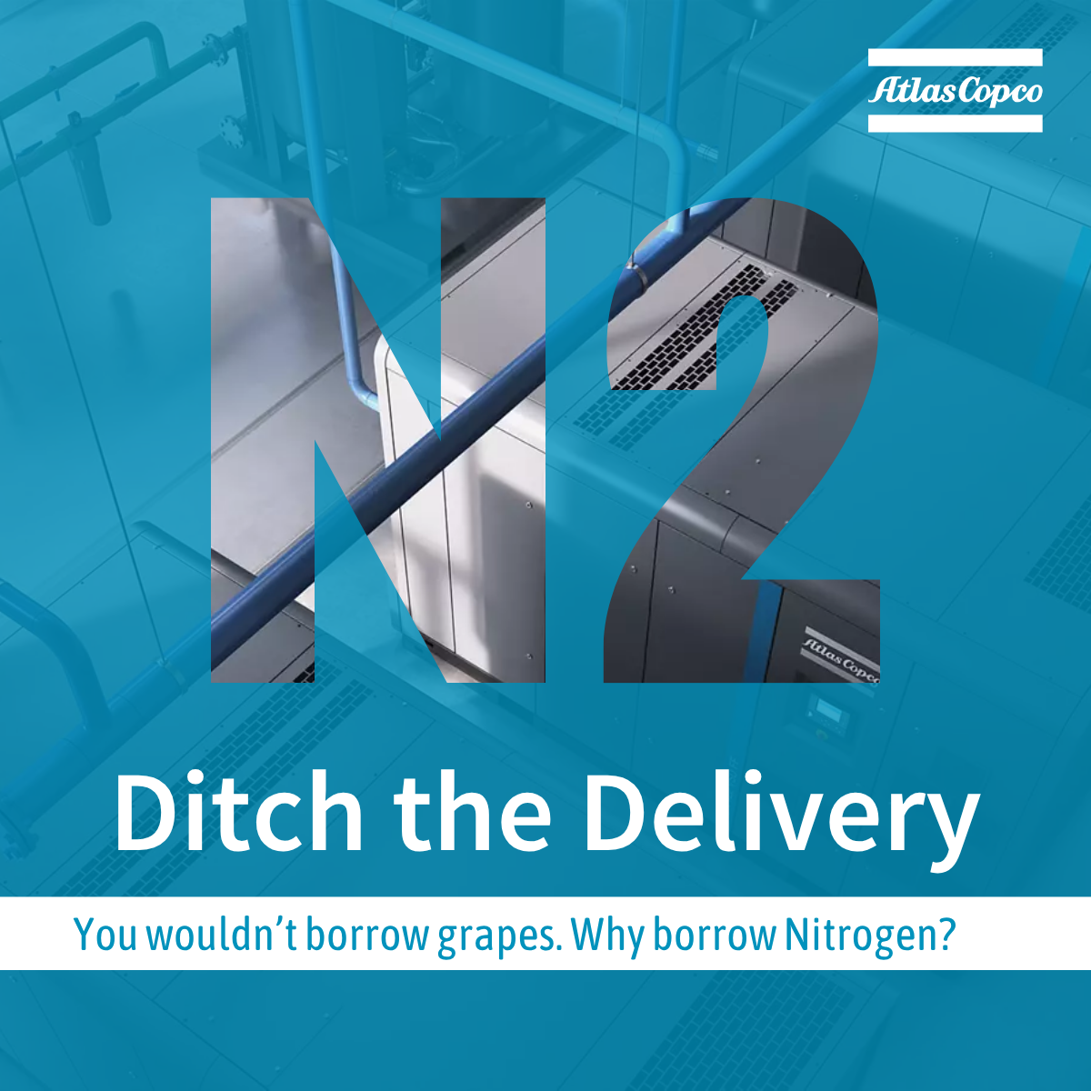 Generating nitrogen onsite means fewer interruptions, better wine stability, and a more sustainable operation. Whether you're blanketing tanks, purging lines, or preserving headspace during bottling, Atlas Copco’s PSA and membrane nitrogen generators deliver what your wine needs, when it needs it. Already have an air compressor? You’re halfway there.