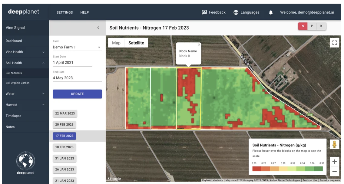 One notable AI product from Deep Planet is VineSignal, which monitors regenerative agriculture, soil health and sustainability. VineSignal tracks soil and plant nutrients, soil organic carbon and water management, including irrigation leaks and evapotranspiration. It also improves harvest logistics and efficiency, enhances grape quality by pinpointing the best harvest times, and creates yield maps. Additionally, it detects diseases and risks to vine health, covering major pests and diseases and supporting regular vineyard surveys. Vine technology aids in achieving carbon-neutral certifications and enhances sustainability throughout supply chains.