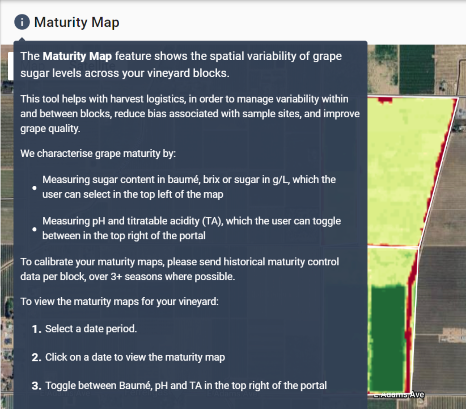Reach out if you're like to monitor pH and TA (along with our Brix maps and harvest date features) in your vineyards for the current season.