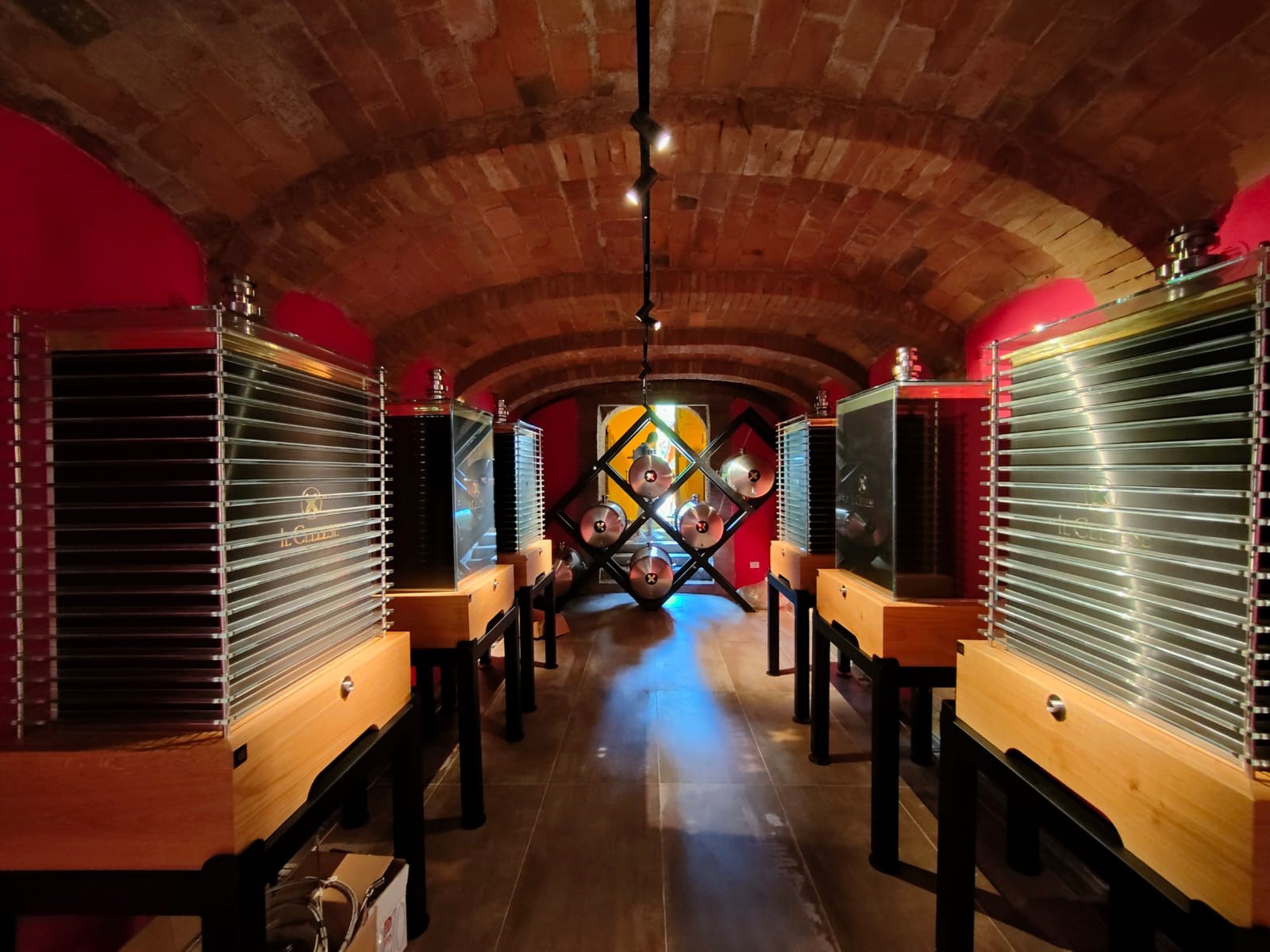 Designed by Defranceschi, 6 flacons positioned on a wooden support, (capacity 250lt) specific sepage/terroir ready to be “assembled” per glass are stored. In the 6 cylindrical tanks which are positioned on a metal structure, the “assembled wines” ready to be bottled are stored.