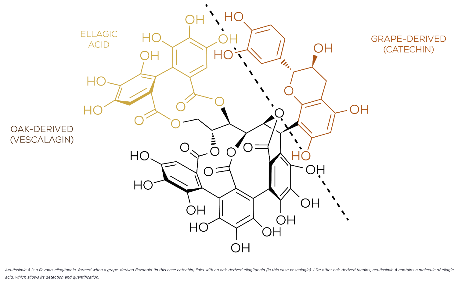 More recently, it has been shown that oak tannins react with grape-derived wine phenolics, creating flavono-ellagitannins: a whole class of “hybrid” compounds containing both a grape derived flavonoid piece (either an anthocyanin or a flavanol), and an oak-derived piece. These compounds can be considered the “hidden” part of oak-derived tannins in wine. They evade detection by usual analysis methods, including HPLC, but play a determining role in enhancing color stability, modulating bitterness and astringency, as well as enhancing antioxidant properties.