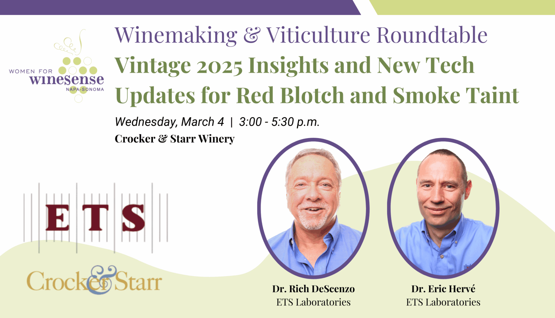 February 10, 2026 (Napa / Sonoma, CA) — On Wednesday, March 4, 2026, from 3:00 – 5:30 p.m., the Winemaking & Viticulture Roundtable of the Napa-Sonoma chapter of Women for WineSense (WWS) will host a timely proprietary technical presentation, “Vintage 2025 ETS Insights and New Tech Updates for Red Blotch and Smoke Taint.