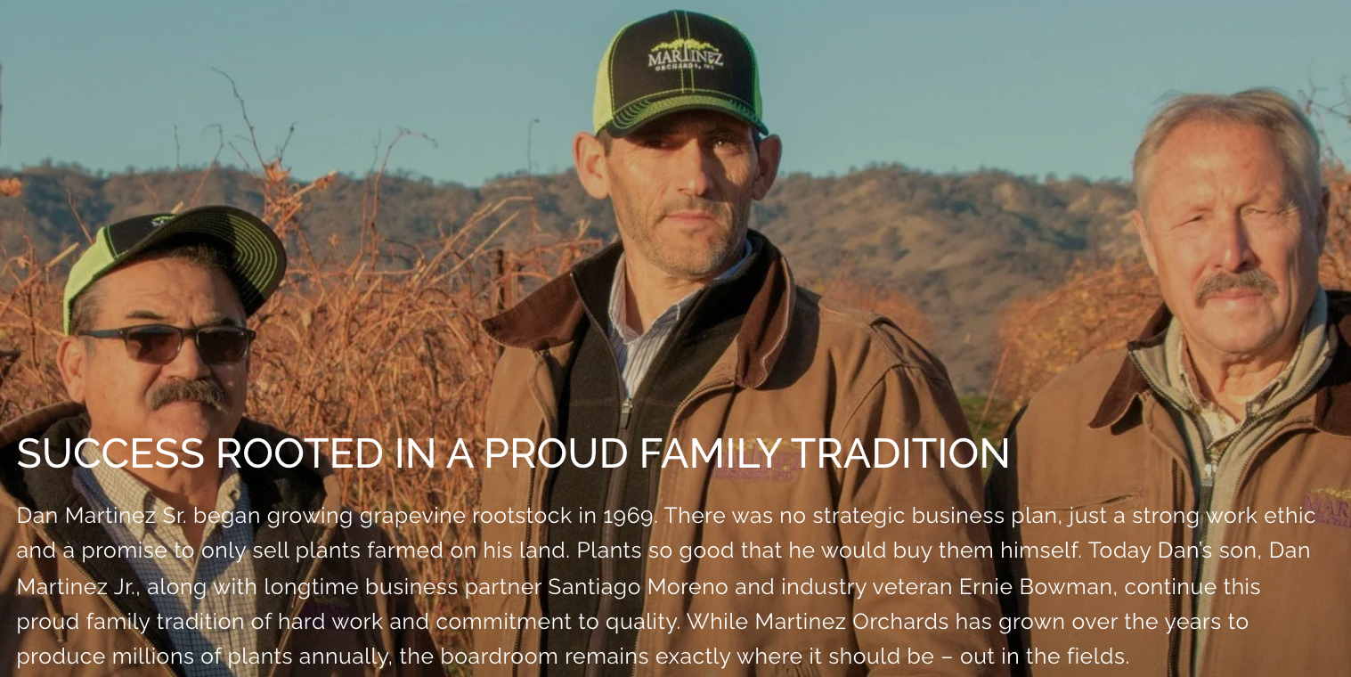 Martinez Orchards is one of the most trusted and respected names in the grapevine nursery business. We’ve earned that reputation through years of hard work, honesty, integrity and a commitment to our customers. We provide unequaled support with our knowledgeable sales people and highly experienced production team. We know successful plantings allow us to fulfill our promises. We strive to buildlasting relationships with our customers based ona foundation of mutual steadfast trust.