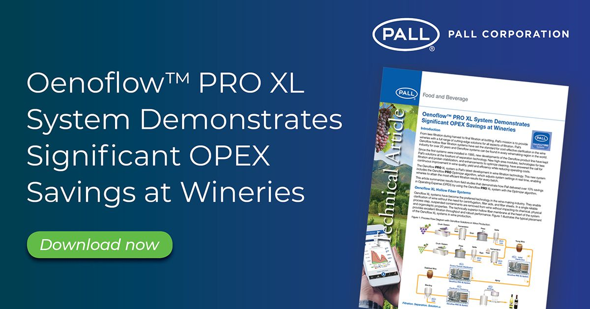 The Oenoflow™ PRO XL system is Pall’s latest development in wine filtration technology. This new system includes the Oenoflow PRO Optimizer algorithm, which adjusts system settings in real time, enabling wineries to attain the most efficient filtration results for every batch. Download your copy now, "Oenoflow PRO XL System Demonstrates Significant OPEX Savings at Wineries" and learn how you can save up to 10% in OPEX too! https://go.pall.com/oenoflowprom5.html
