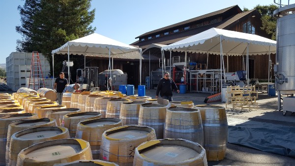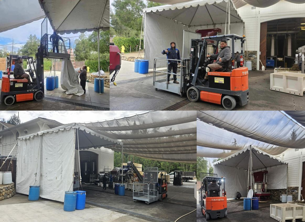 Our crew was onsite at Peter Michael Winery early this morning, setting up a 20x20 tent to shield their press from the elements - ensuring production stayed on track despite the storm.