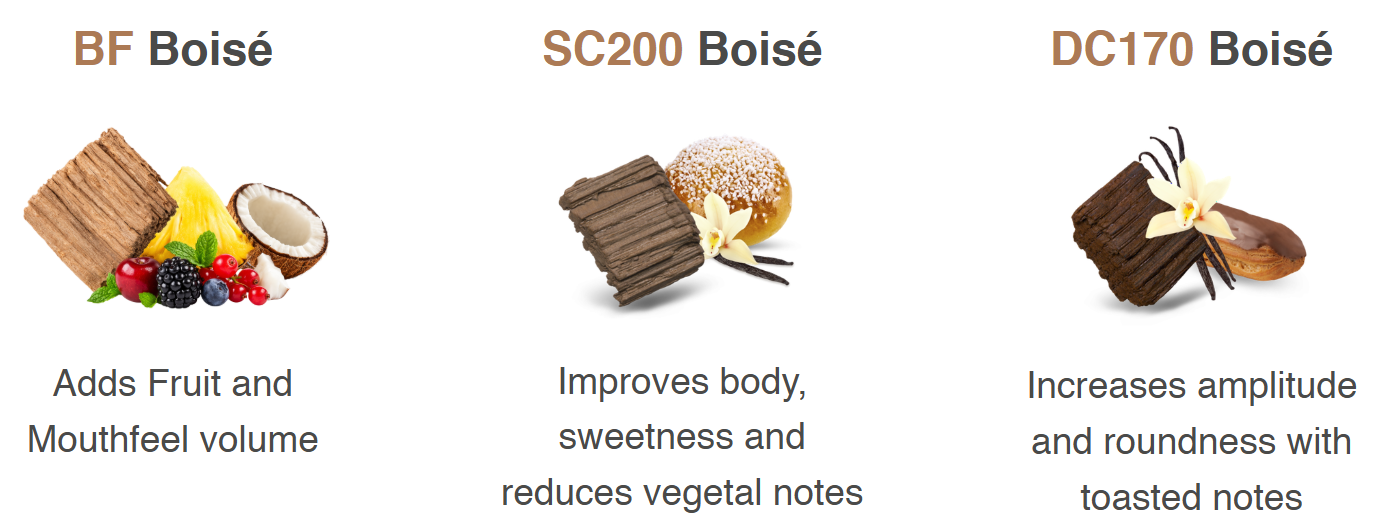 Boisé Absolu blends, made from natural oak and cherry extracts, provide high aromatic intensity to structure your profiles, enhance texture, and extend length on the palate. ![]() | ![]() |