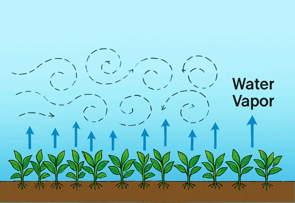 In the case of water vapor, the water vapor concentration (when it is not raining) is higher within and just above a plant canopy than it is in the air above the canopy. Turbulent eddies mix the moister air below with the drier air above (Fig. 1). In the portion that is swirling upward, vapor is brought upward. In the portion that is swirling downward, drier air is brought downward.