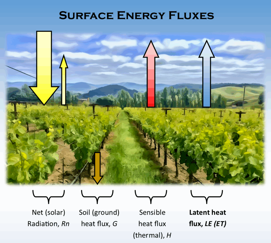 Here at AV, we’ve made use of impactful technologies to help growers irrigate efficiently and control vine stress to improve wine quality from their vineyards. Our primary tools have been the soil moisture probe and, more recently, the Florapulse microtensiometer. Both tools have been indispensable and even more so now that we have our own data portal to view and analyze these data streams. More recently, we’ve been working with a new tool, an eddy covariance device, for direct measurement of ET, which gives us another approach for irrigation management that we didn’t have before. Before I introduce this new tool, let me explain what direct measurement of ET is and how it differs from other ET measurements.