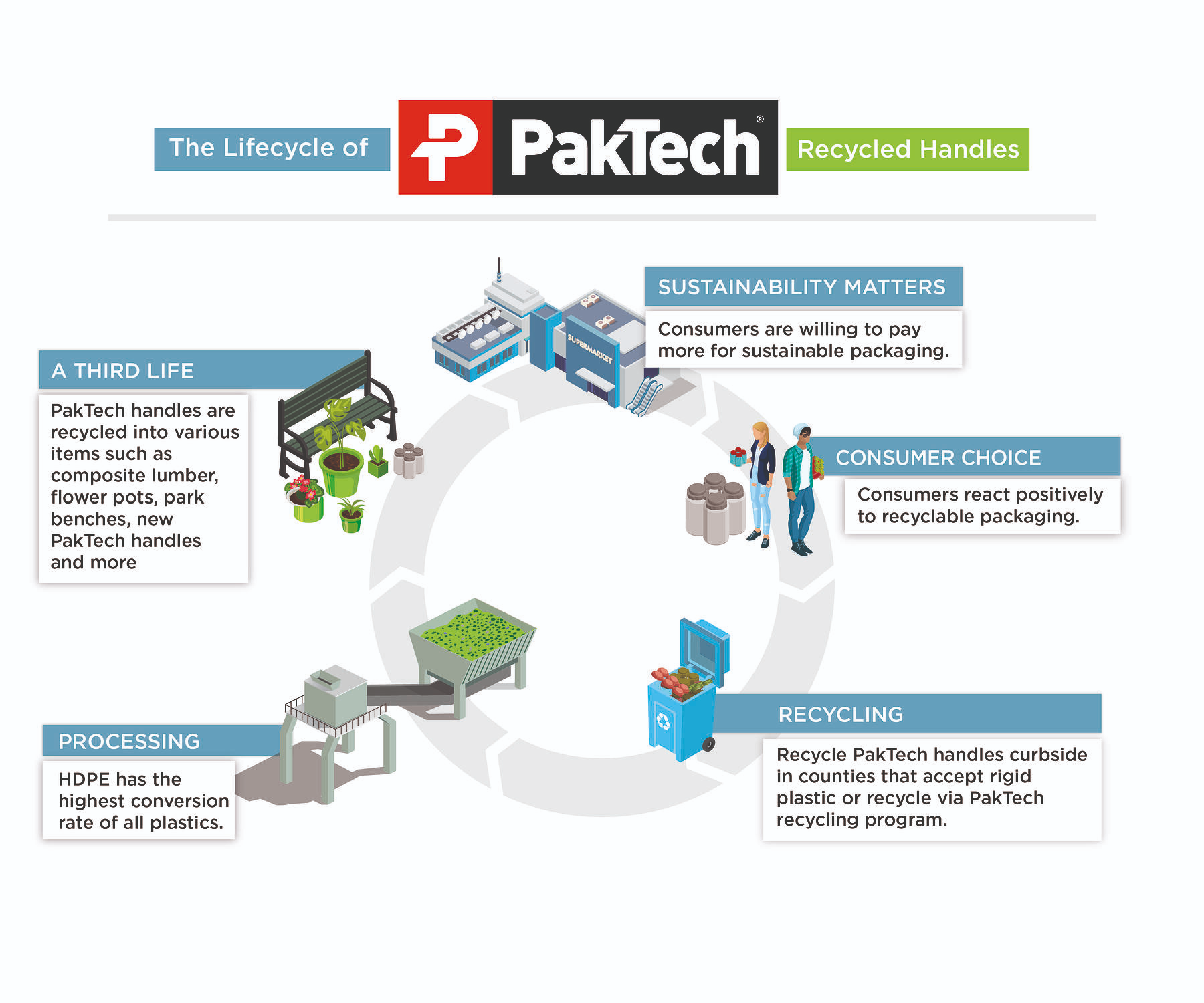 We couldn’t do any of this though without our partners. From the consumer drop-off partners plus the consumers who recycle, consolidators who collect used handles, and reprocessors who transform them into new products, it’s our partners who help make sure the 100% recycled plastic within each PakTech handle is recycled and repurposed again and again.