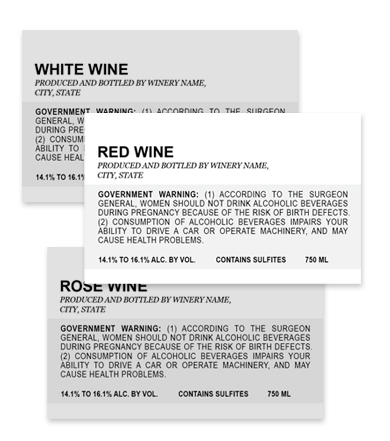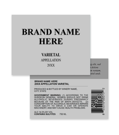 One size - 4” x 2.5” (10.16cm x 6.35cm) Fully editable in Acrobat (pdf), Word (docx), Pages (pages), and Illustrator (ai) Several templates are provided for each wine class/type — each covering a different percentage range of alcohol Adheres to TTB labeling laws for containers up to 3 Liters (101 fl. oz.) Contains system fonts only so there’s no need to buy/install fonts in order to edit placeholder copy Designed with only minimal amounts of information so they can be applied to a variety of wines.