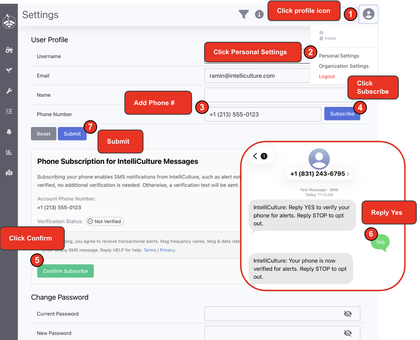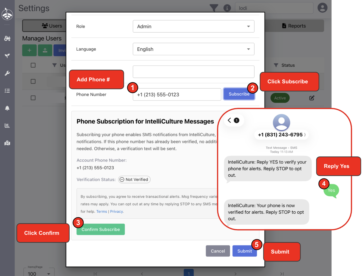 Admins will need to add phone numbers for users in User Settings and subscribe them as shown below. You'll receive a confirmation text - just reply YES to activate.