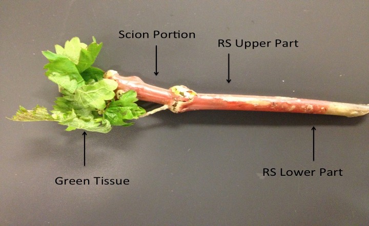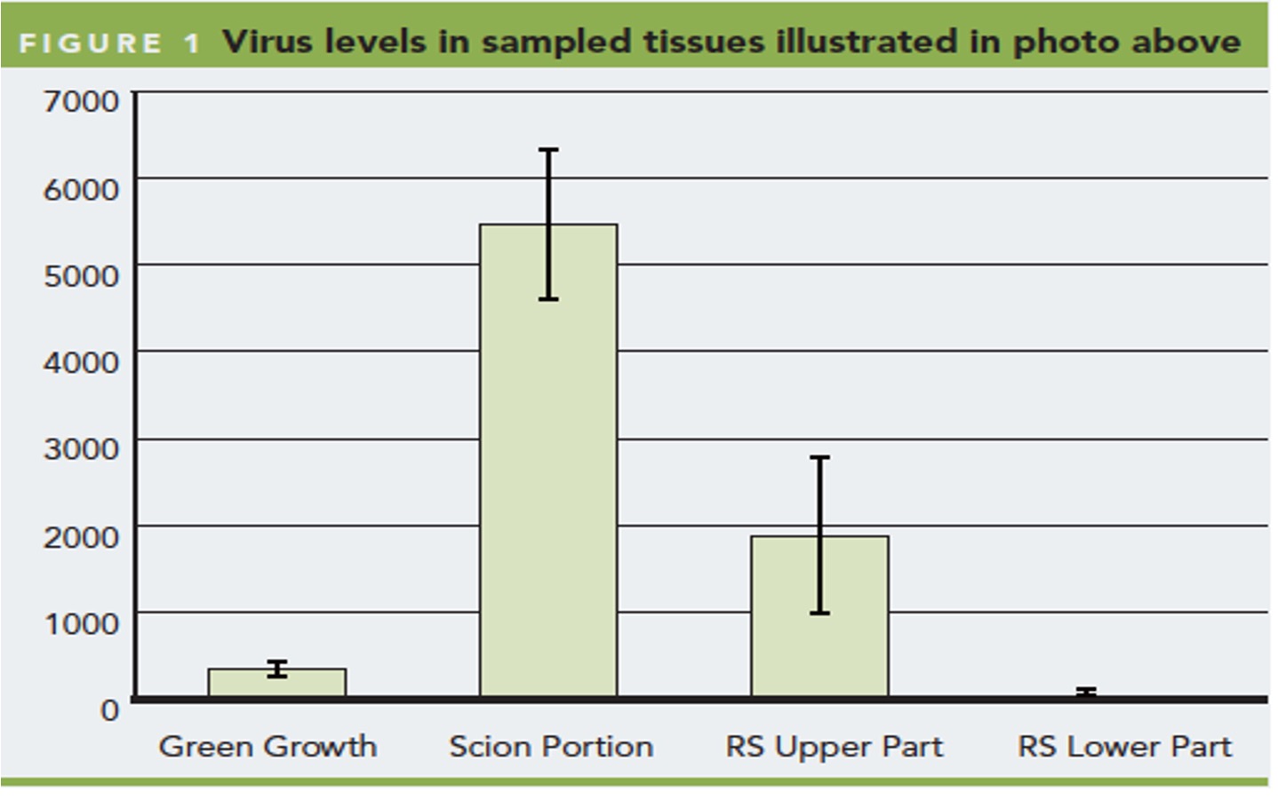 We have studied the relative level of red blotch virus in green grafted vines and found that the virus titer level can vary significant in different parts of the vine. Sampling positions and data are shown below. This knowledge has been instrumental in guiding us how to best sample the green vine in order to provide the most accurate results during this time of the year.