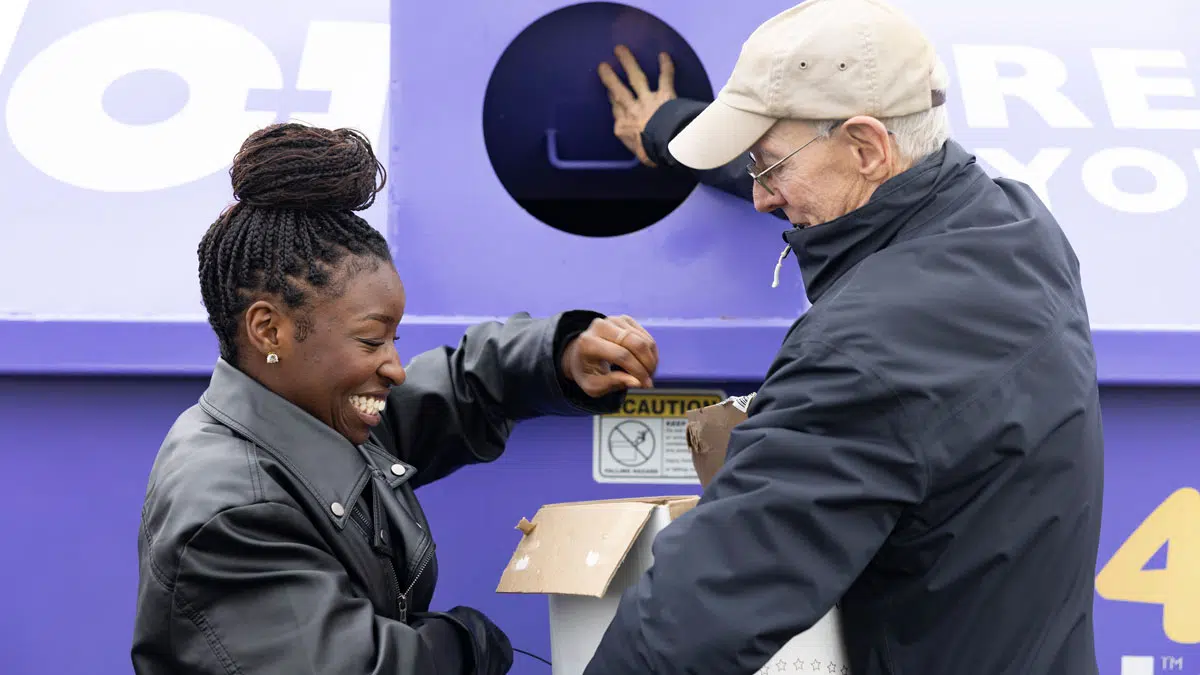 Carlyle Coppins with WNKY and Tom Flynn, United Way of Southern Kentucky Board member, recycle glass bottles at the Glass4Good launch in November. (Source: United Way of Southern Kentucky)
