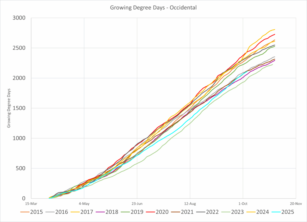 Occidental shows a similar situation. 2025 (cyan) was slower to accumulate heat than most years but was warmer during the spring compared to 2023.
