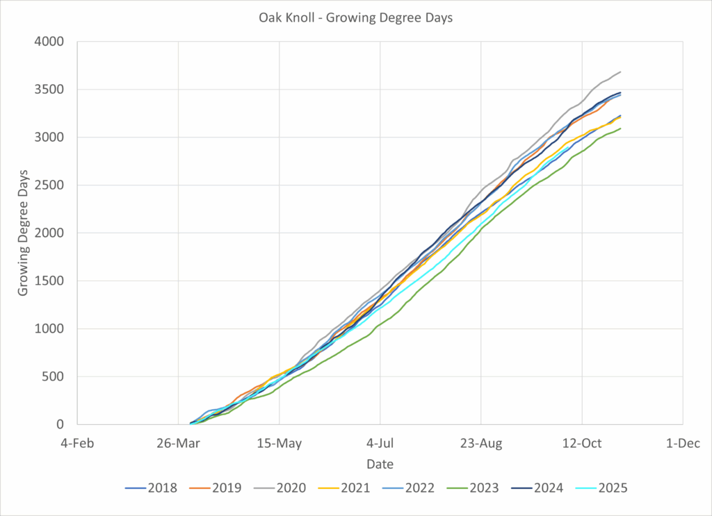 Oak Knoll, which is typically cooler than other parts of the valley, saw 2025 coming in just above 2023 but with a warmer spring.