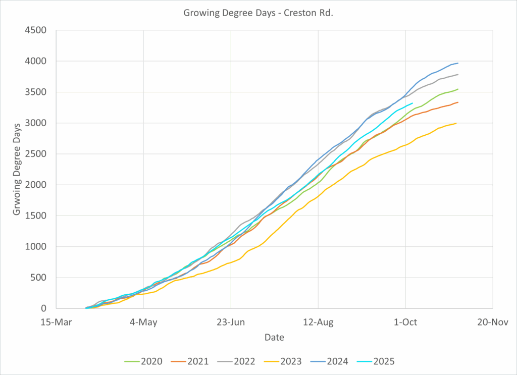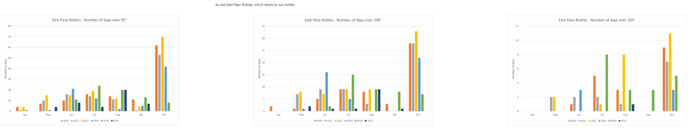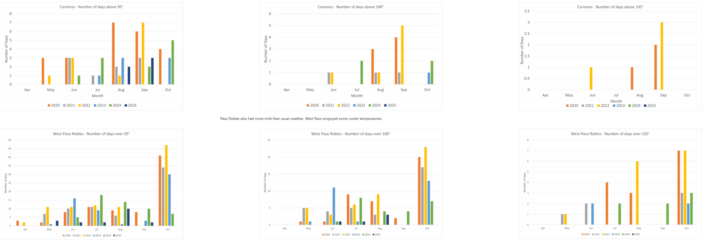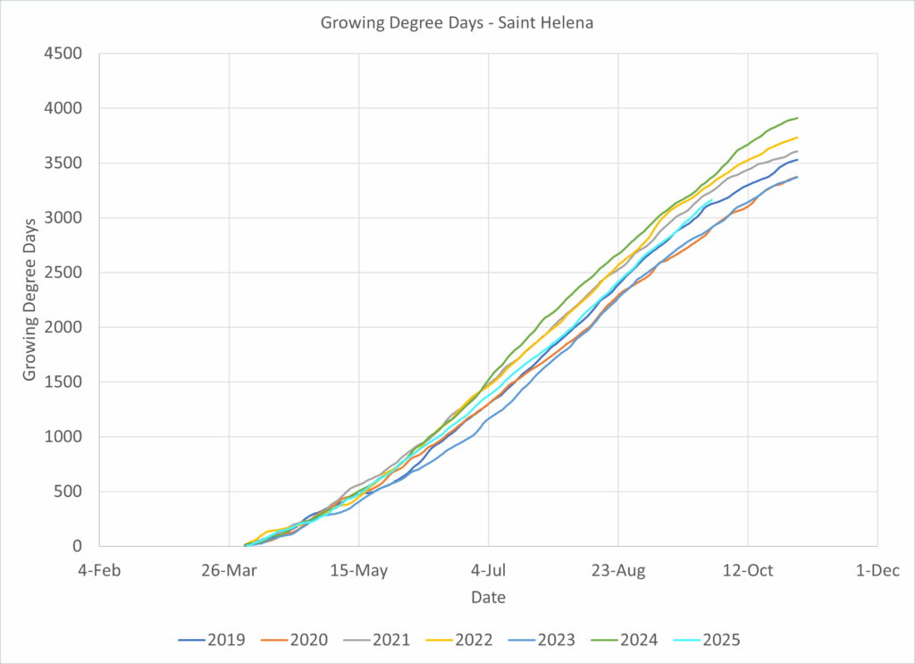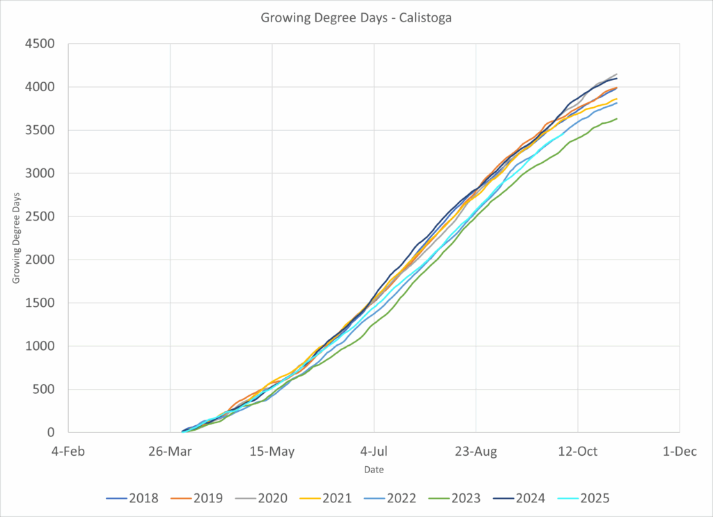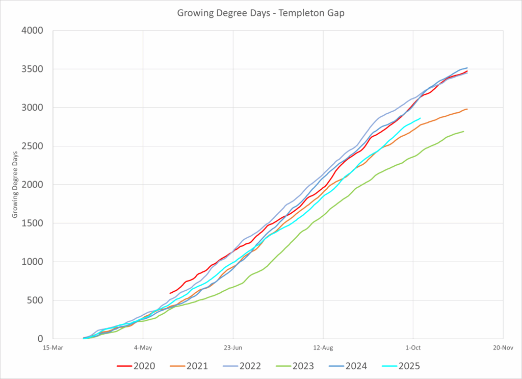 In Templeton, a fairly cool zone with influences from the ocean, 2025 was a much more typical year with respect to 2023 and tracked with 2021.