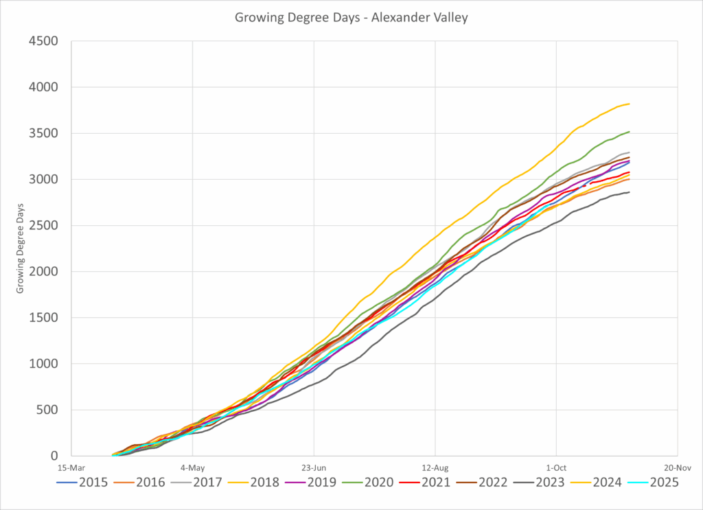 For the Alexander Valley 2025 (in cyan) comes in just below the previous 11 years except for 2023