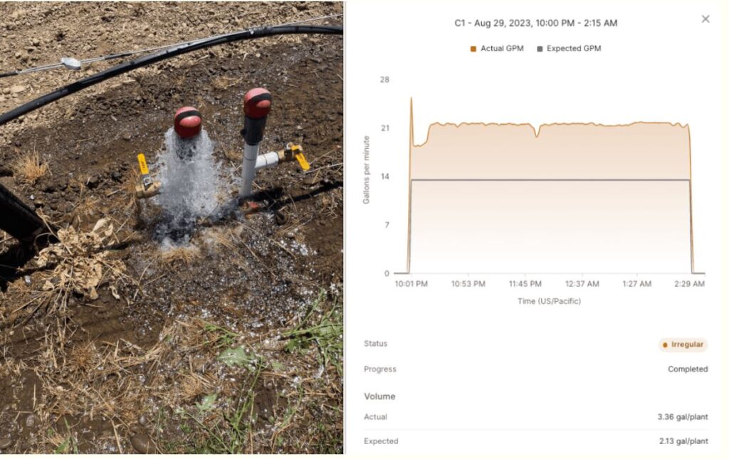 The above photo showcases how Lumo can be used to detect problems in an irrigation system. If the reported GPM is much higher than what you expected, you may have a leak, or in this case, a malfunctioning air vent.