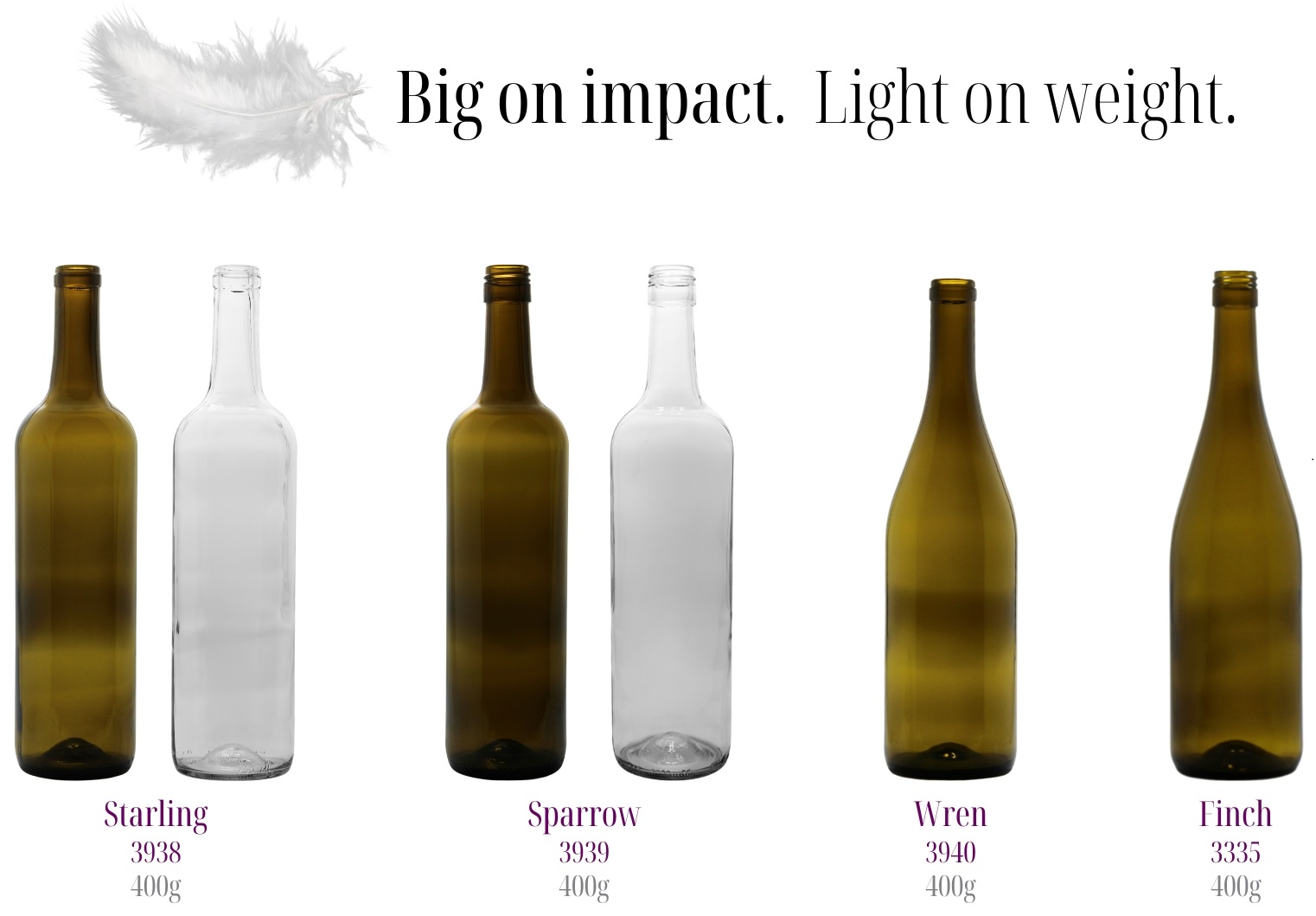 Say hello to Starling, Sparrow, Wren, and Finch — each crafted to reduce your footprint without compromising quality. Available in classic Burgundy and Claret styles, in both Antique Green and Flint, with your choice of screw cap or cork finish.