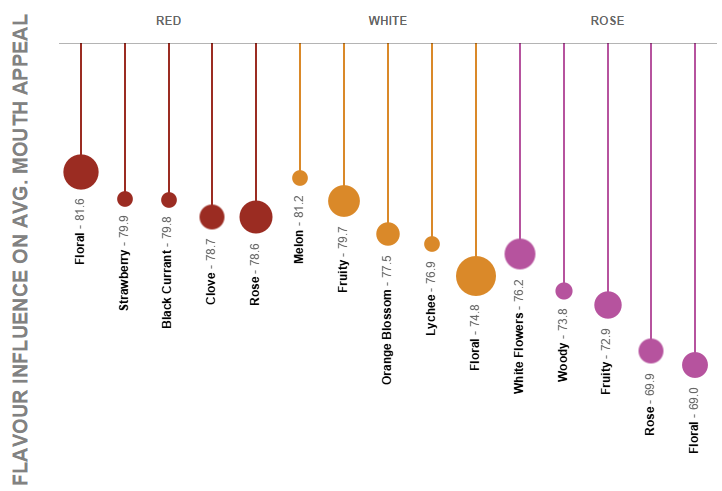 FLORAL NOTES ARE KEY TO TASTE PREFERENCE IN RED AND ROSE WINES – Floral forward taste impression is associated with higher mouth appeal average scores by millennials for red and rose wines, but not for white wines.