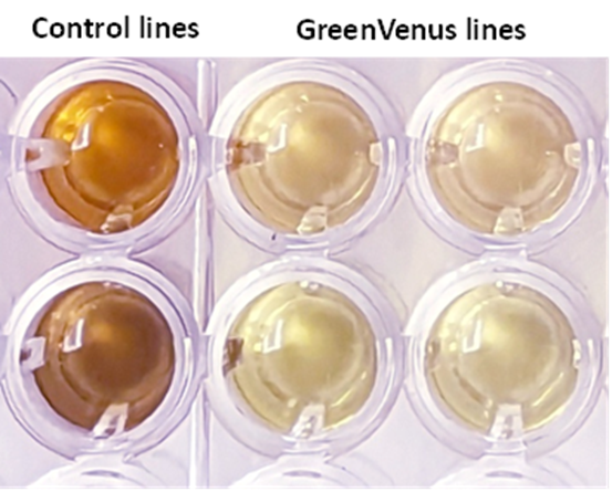 GreenVenus lines have reduced oxidative browning: enzymatic browning was measured after 18 hours in control lines (control) and GreenVenus lines.