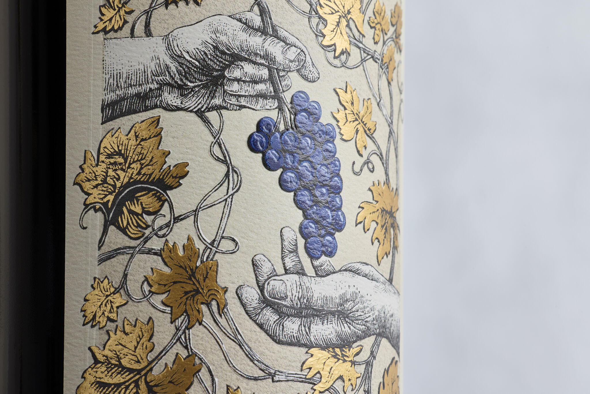 This label for B. True Cabernet Sauvignon was built for contrast you can see and feel. Gold foil weaves through the vine work, sculpted emboss lifts the illustration off the bottle, and spot UV on the grapes adds a glassy highlight against the matte background.
