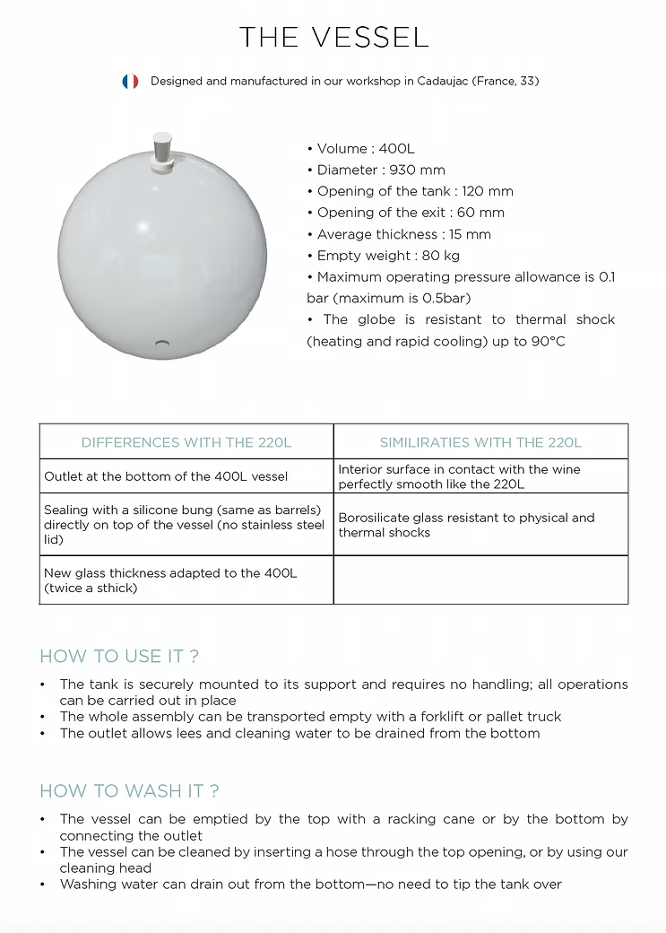 CEO of Famille Paetzold and Wineglobe, Marie's goal was to make the bigger 400L Wineglobe entirely made of glass and more practical to use in the cellar. Hence, a large 120 mm bung opening and 90 degree elbow allow for easy cleaning with water between usages. The 400L Globe lives on its' forklift friendly stand allowing the winemaker to never need to displace or manipulate the globe itself.