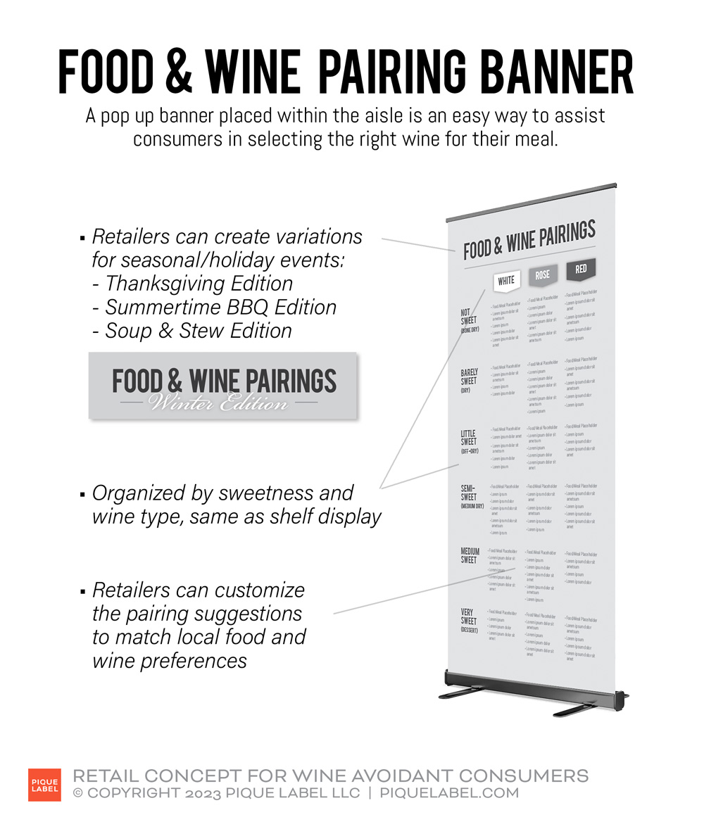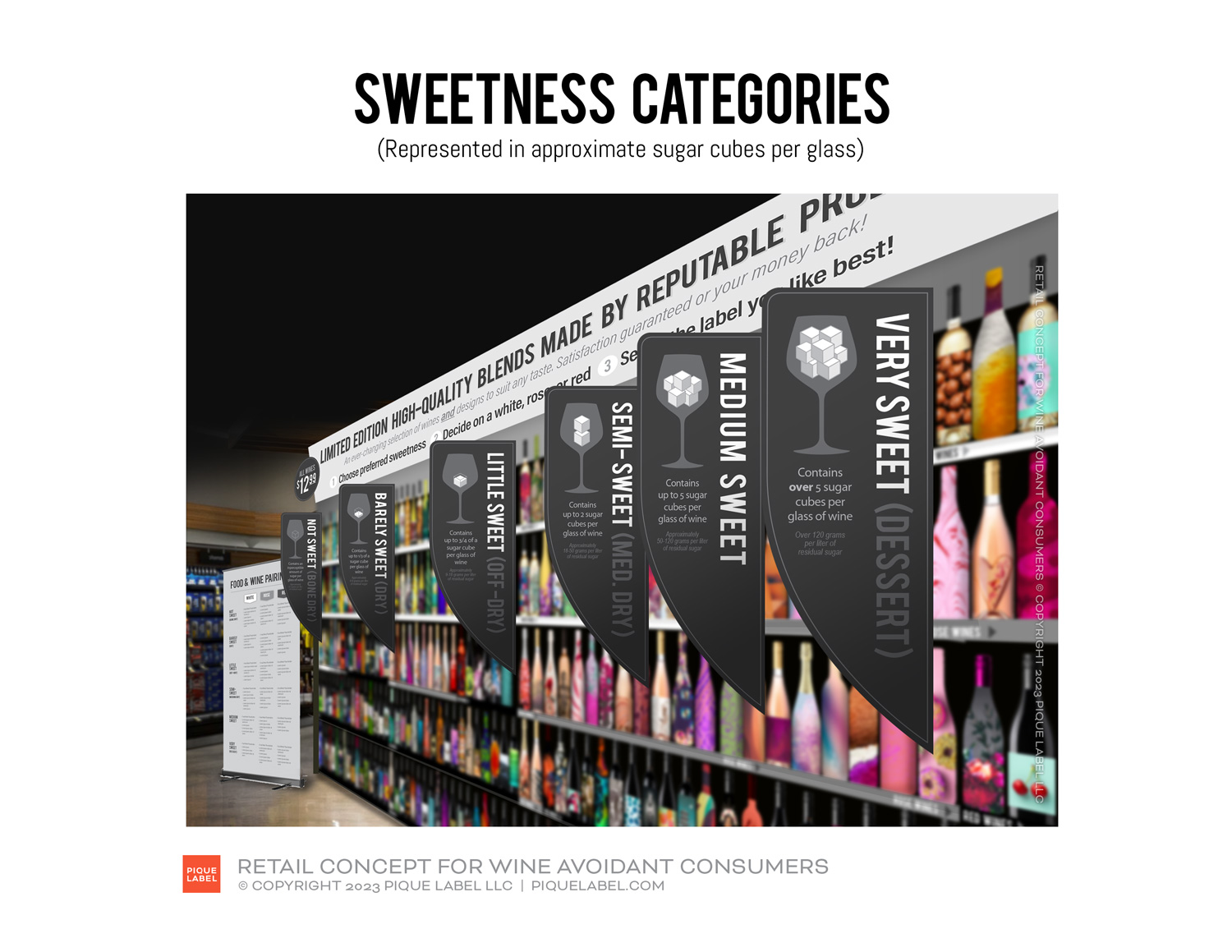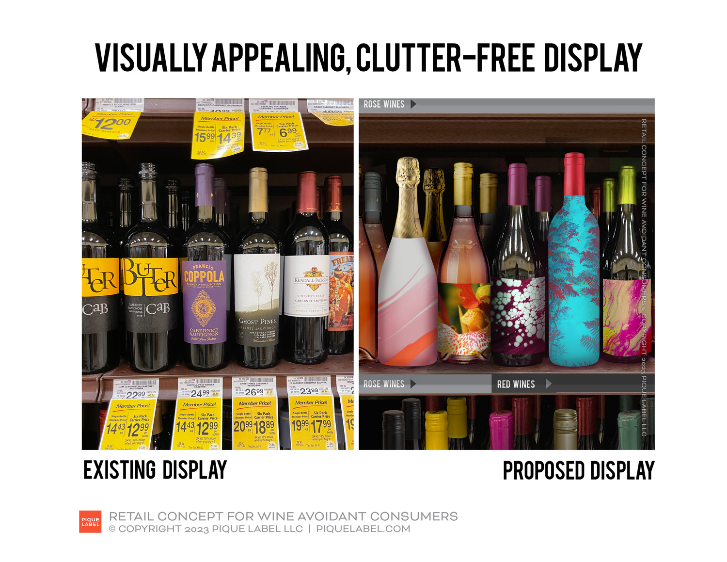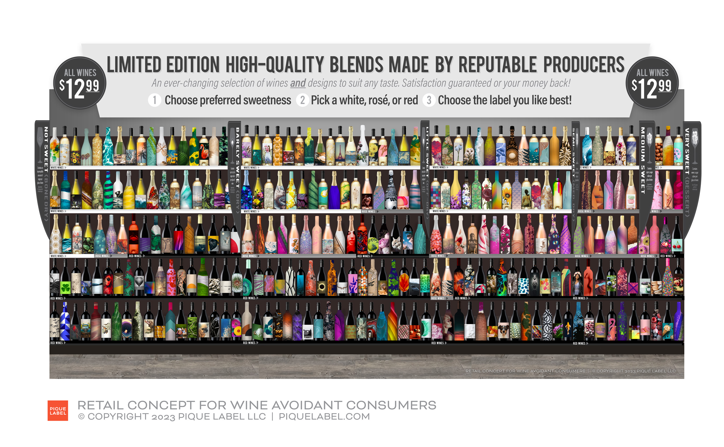 Wine avoidant consumers need their own, uniquely designed wine aisle display — a well-organized, aesthetically pleasing, comprehensible, clutter-free display that offers an ever-changing variety of limited edition, design-focused, non-branded, non-varietal, easy-drinking blends categorized by sweetness, subcategorized by type (red, white, rosé), and all priced exactly the same, in the $10-15 range.