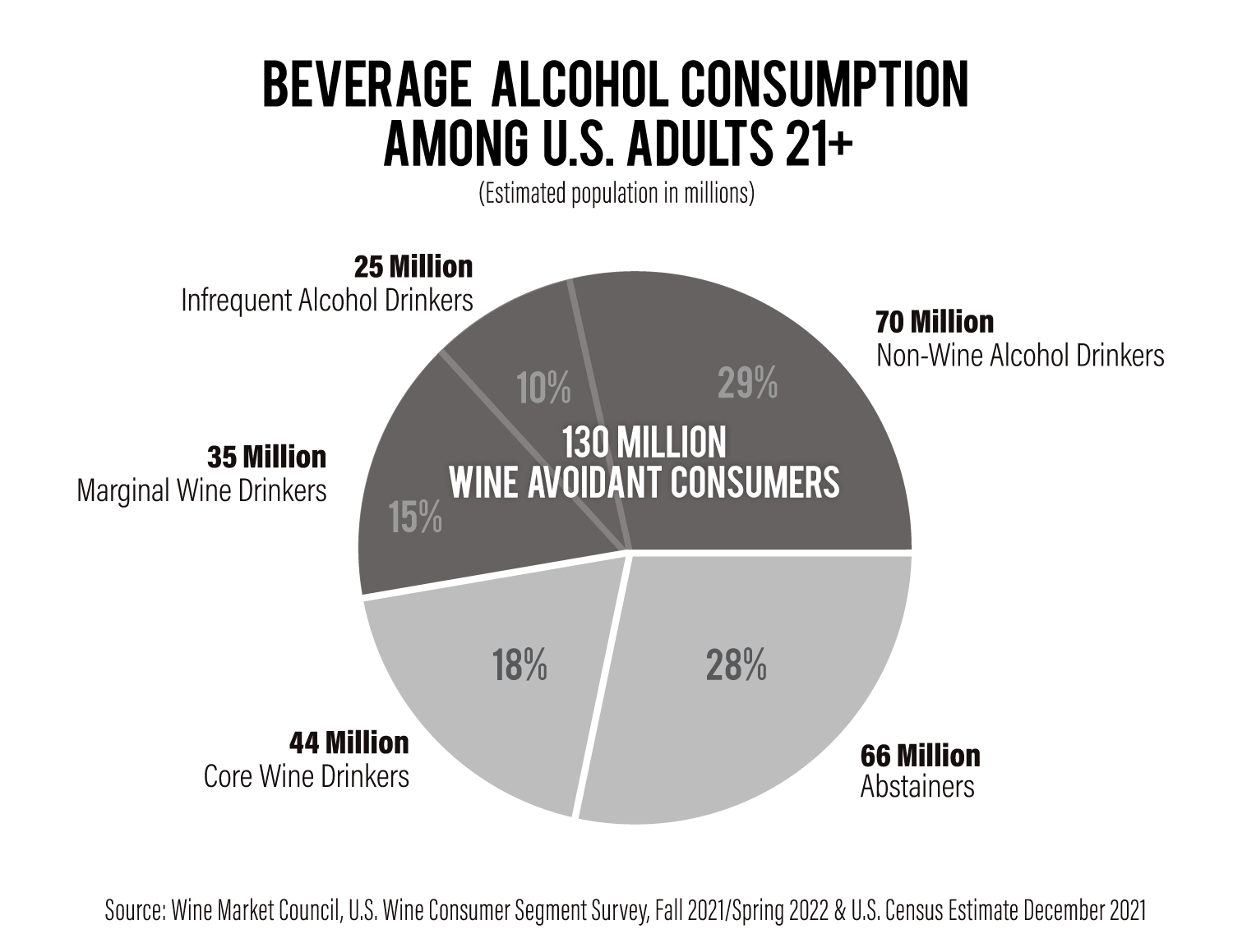 It’s clear the U.S. wine industry is experiencing a decrease in consumer demand, especially in the lower and middle market tiers. Domestically, the industry generates most of its revenue from 44 million core wine drinkers (a mere 18% of the 21+ U.S. population), so even the smallest decline in sales is cause for alarm. The other portion of the 21+ U.S. population who drink alcohol marginally, rarely, or never buy wine — a staggering 130 million people who, for the purpose of this article, will be referred to as wine avoidant.