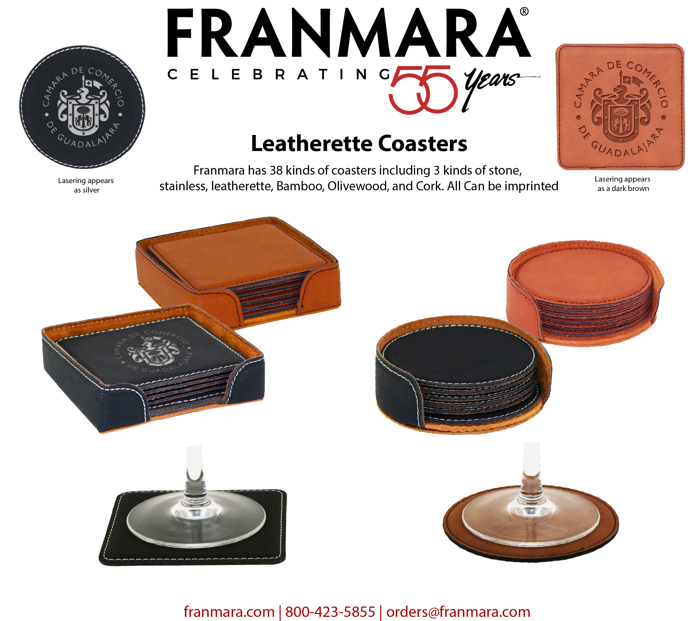 Franmara has 38 kinds of coasters including 3 kinds of stone, stainless, leatherette, Bamboo, Olivewood, and Cork.