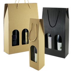 These are strong wine bottle carriers. The one-bottle, two bottle and three bottle boxes are made of highly elastic and tear resistant Kraft cardboard. They come in tan and black colors with a perfect place for your business trademark. Punched in windows are attached and help stabilize the contents and prevent the bottles from contact. Made with sturdy and strong cord handles.