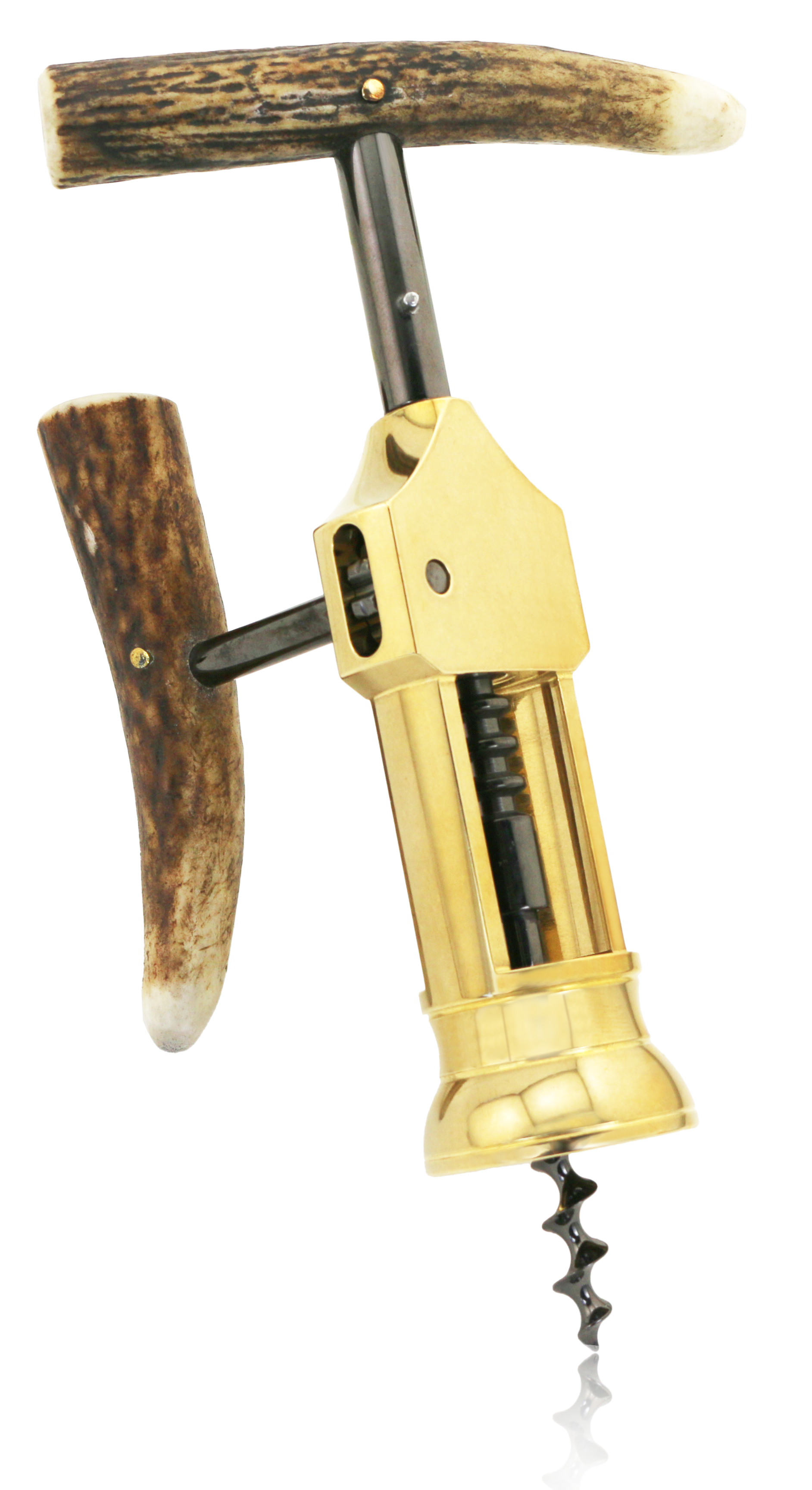 Hand finished reproduction of an early 18th Century English Corkscrew featuring a rack and pinion gear system. It has an antiqued brass finish. The antlers’ horn colors, tones, and patterns will vary as they do in nature. 7-1/2” high. Retailing around $398.00.