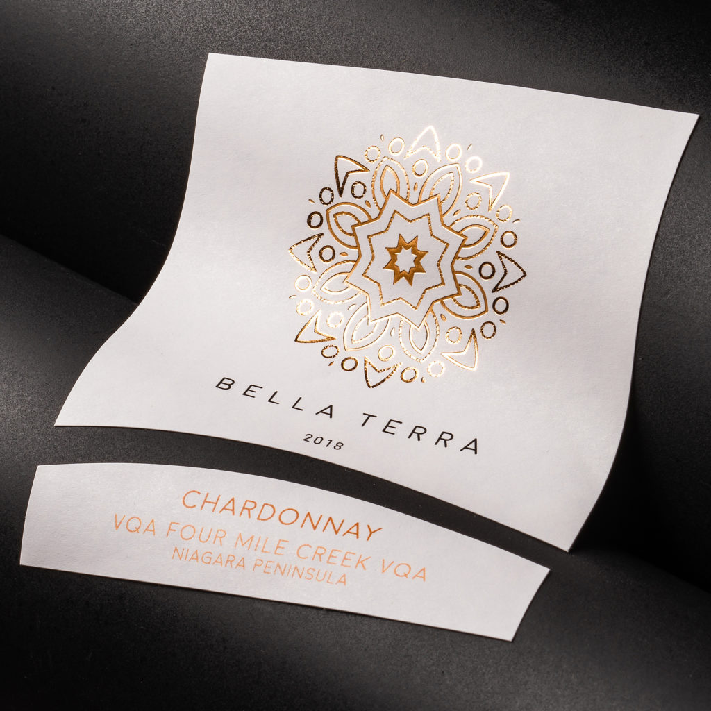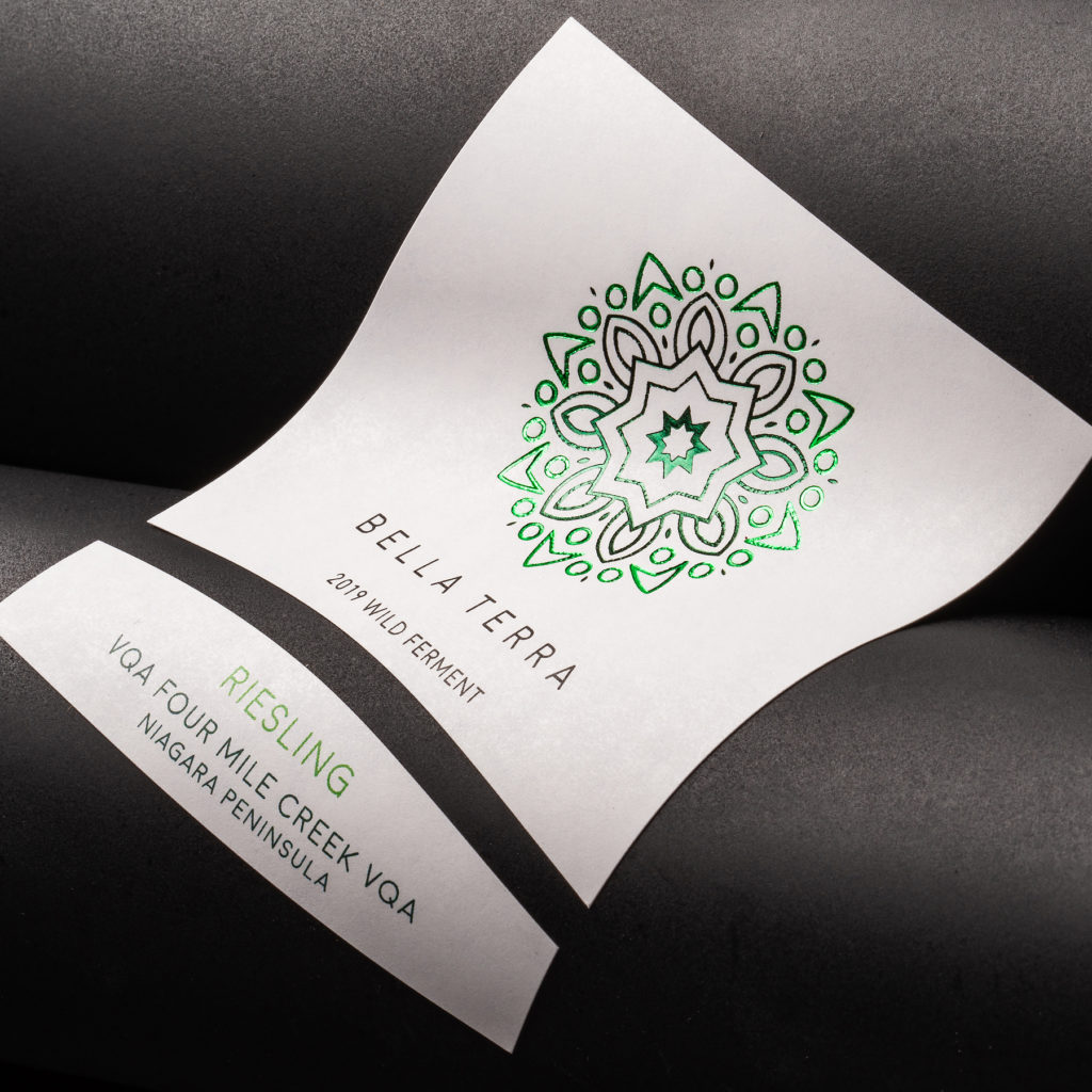 They kept the same material — the flat matte weld — but switched to more cost-conscious embellishments. While the high-end Bella Terra wines used a hot stamp over the medallion, we recommended they switch to a cost-effective raised varnish for these entry-level wines. Embellished labels are within reach at many different price points, both high and low. It’s about aligning the right embellishments for the right brand.