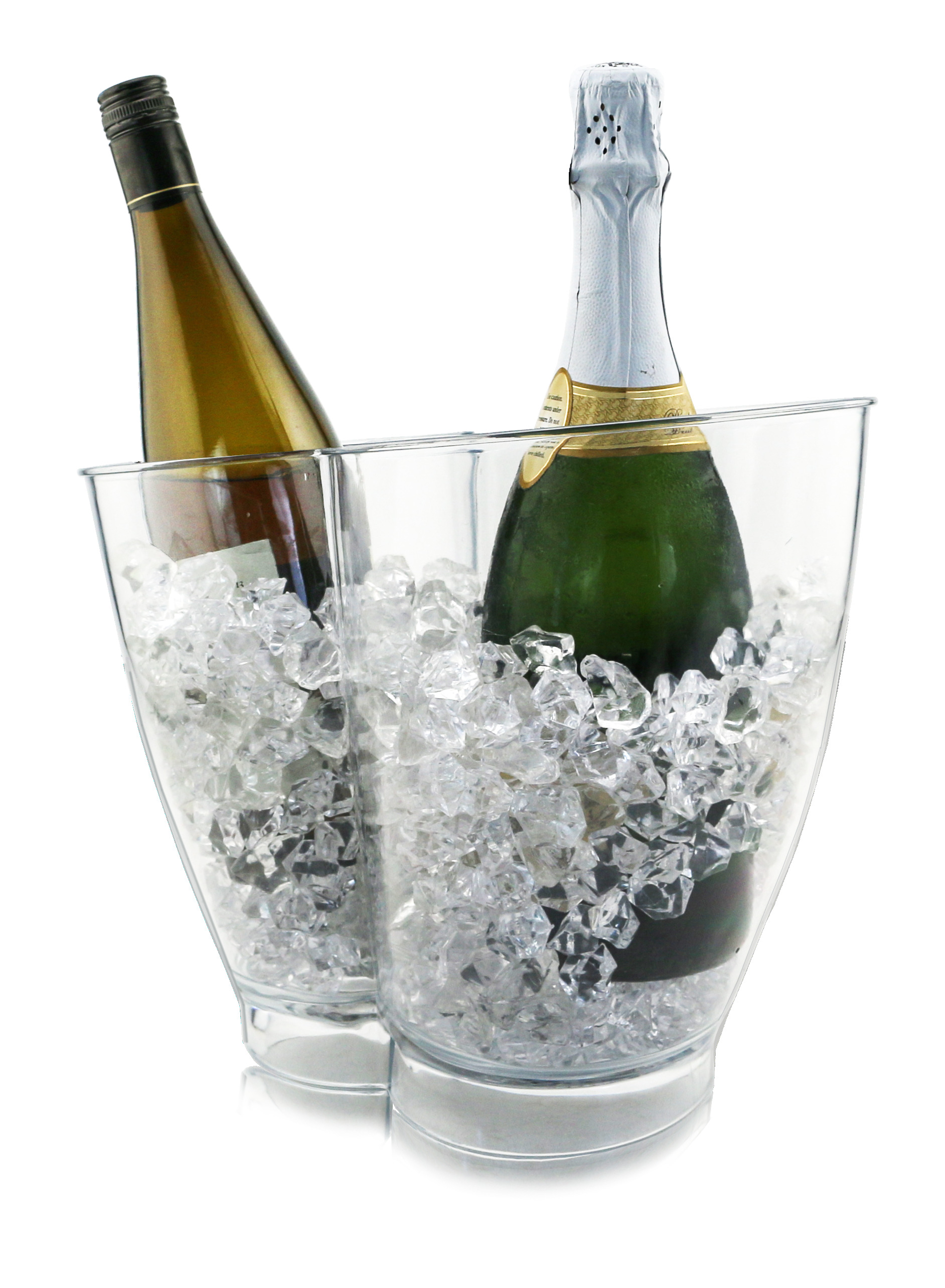 An attractive double bucket. The one larger compartment can accommodate a Champagne bottle; the other side holds a still wine bottle. 12” across, 7-1/2” across base, 10-1/4” tall. 5-1/4 qt. capacity.