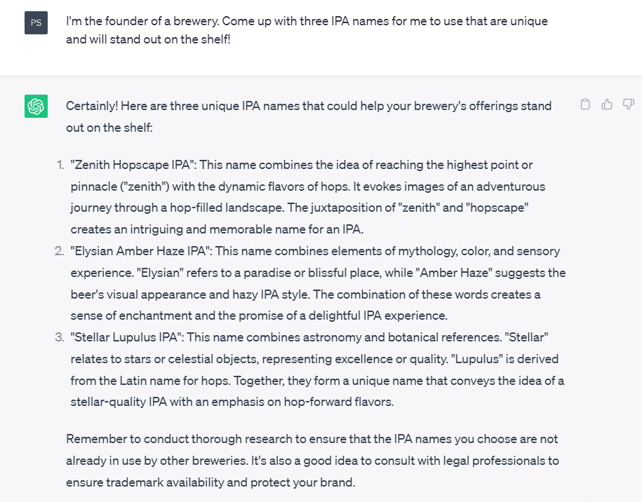 We put ChatGPT to the test. (A very unthorough and totally inconclusive test run by beverage can experts and AI amateurs’.) We asked it to come up with three IPA names for our brewery that are unique and will stand out on the shelf! If you’re interested in brewing a Stellar Lupulus IPA, email us at cans@cansource.com and we’ll make sure your drink packaging looks as good as that beer sounds.