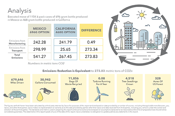 “For a 600-gram bottle produced in Tracy, California, and delivered to Napa,” she explains, “we calculate the CO2 emissions for the trip and compare it to that for a 900-gram bottle produced in Mexico.” Having the estimated CO2 emissions of these two options side by side makes the impact on sustainability crystal-clear for a customer.