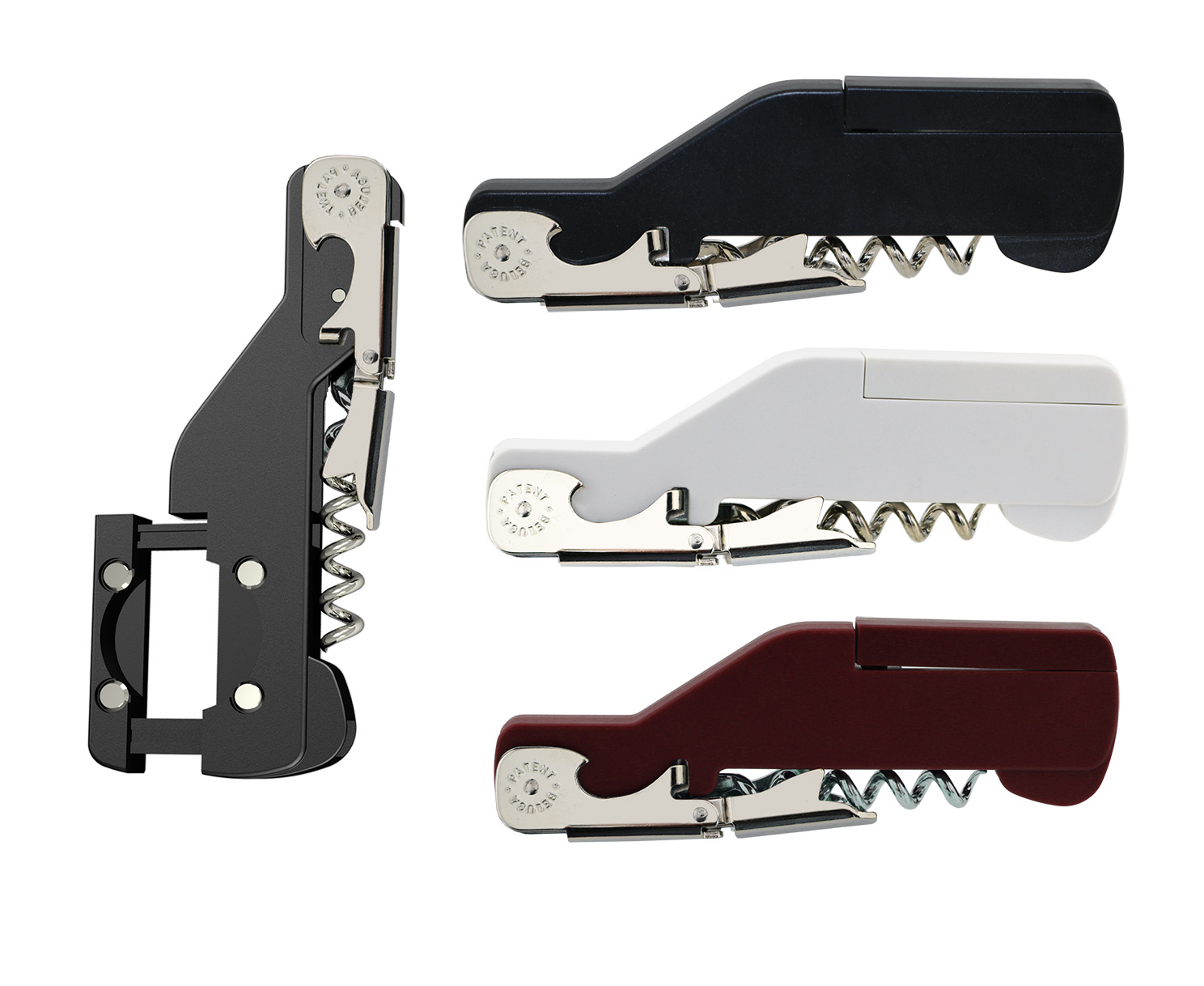 This handy double-lever corkscrew is the latest addition to the Boomerang™ family. A larger grip was added for better control and leverage. Fitted into a compact 4-7/8” length is the extendable four-wheel “FOILKUT” system foil cutter.
