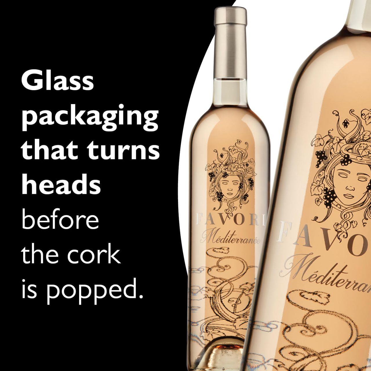 The crystal-clear flint glass showcases the wine’s natural color while a clever double-sided label design creates a 360-degree brand moment.