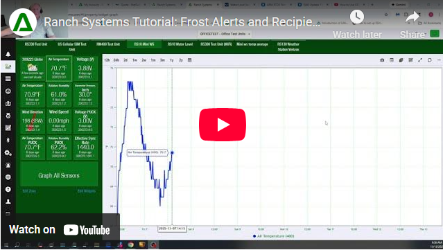 This video walks through how to set up a frost alert in the Ranch Systems platform using any temperature sensor on your property. The demonstration covers selecting the correct sensor, setting the temperature threshold, choosing how the alert should trigger, and adding both property users and associate users as recipients. It also shows how to customize the alert text, insert a live sensor reading, and set repeat and rearm timing. A quick, clear demonstration for anyone who needs automated frost warnings sent by text, email, or voice call.