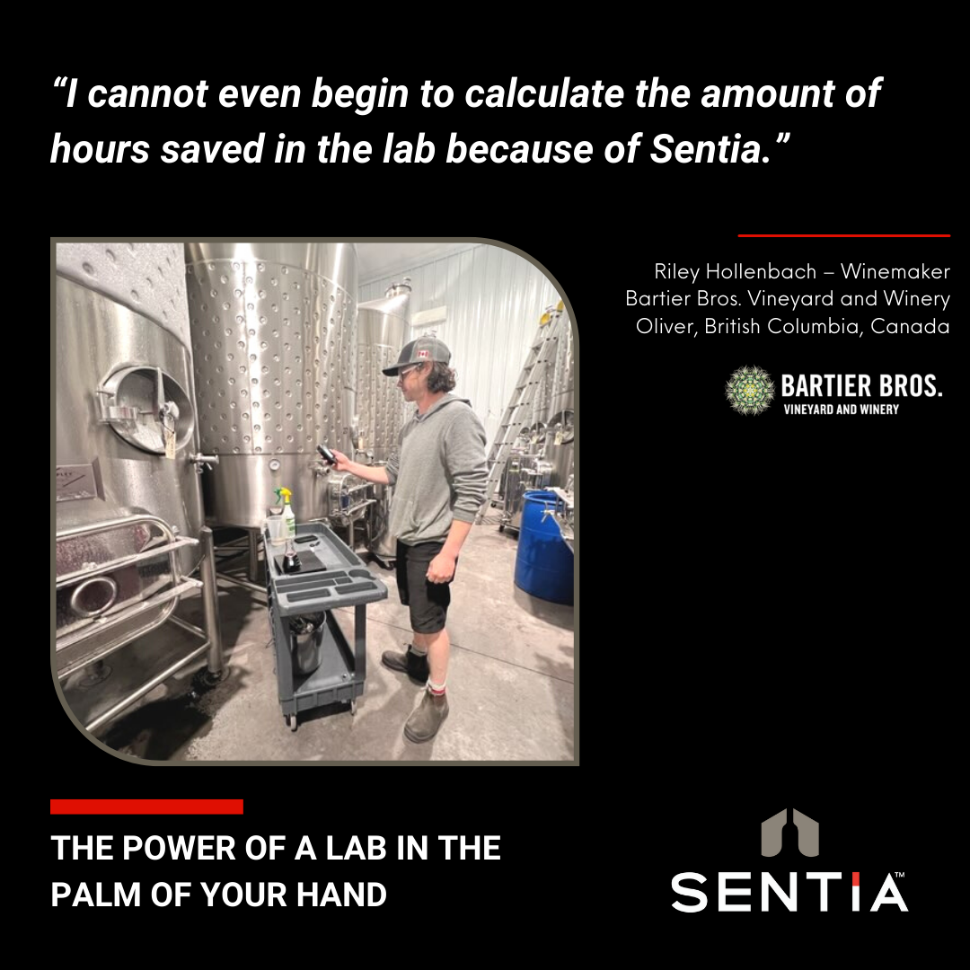 We are happy to share our July Sentia Winemaker Spotlight, Riley Hollenbach from Bartier Bros. Vineyard and Winery: “The Sentia device has been a joy to use as it is so intuitive and very quick. I mainly use it for free sulphur analysis and comparing the Sentia against other methods, aspiration and autotitration, I would recommend the Sentia unit hands down. I cannot even begin to calculate the amount of hours saved in the lab because of Sentia.”