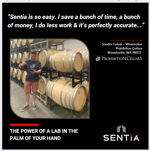 The Sentia is so fast and efficient we have opted to double the amount of testing we do in our barrel program. The unit is portable so if we have any concerns about a tank or barrel it can be tested right away out of the tasting valve or on top of the barrel stack if needed."