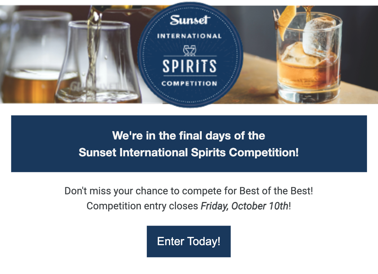 These are your final days to enter the 2024 Sunset International Spirits Competition and rank yourself among the best and brightest in the spirit industry. If you believe your spirit can take top spot, don't miss your chance!