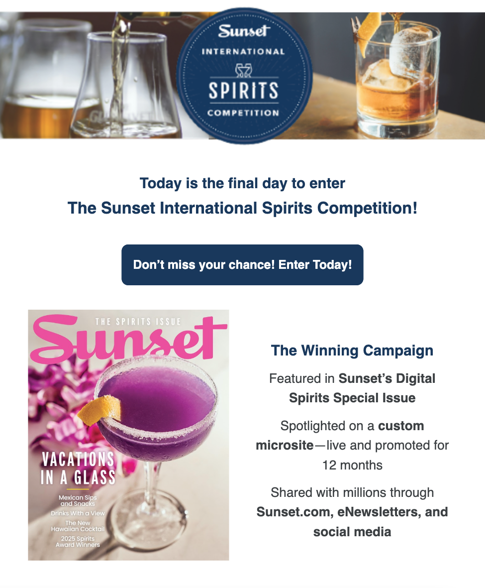 Winning producers will be featured in a Spring release of a Spirits Special non-print, digital edition with supporting microsite. Promotions for Spirits Award Special Issue will be placed in sunset.com, Sunset eNewsletters and Sunset social sites. The edition will be promoted and available for 12 months or until the 2026 Spirit Awards winners are announced. Wine & Spirit Competitions Management & Productions (WSCM&P) will manage the competition.