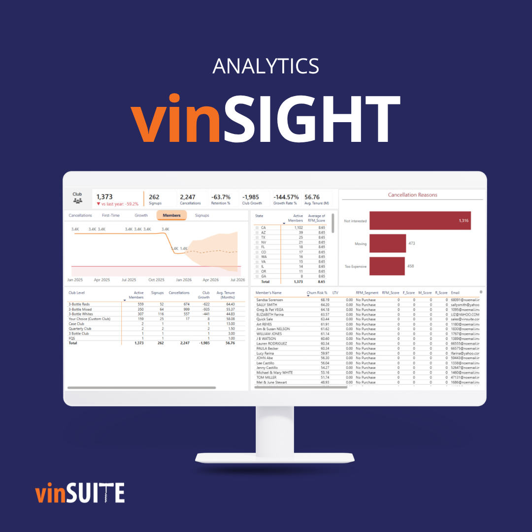 NAPA, CA | January 21, 2026 — vinSUITE, a winery direct-to-consumer software platform, today announced the launch of vinSIGHT, a comprehensive analytics solution that transforms winery sales data into actionable insights. The platform analyzes historical customer behavior patterns to predict wine club churn with up to 94% confidence, enabling wineries to protect revenue before members cancel.