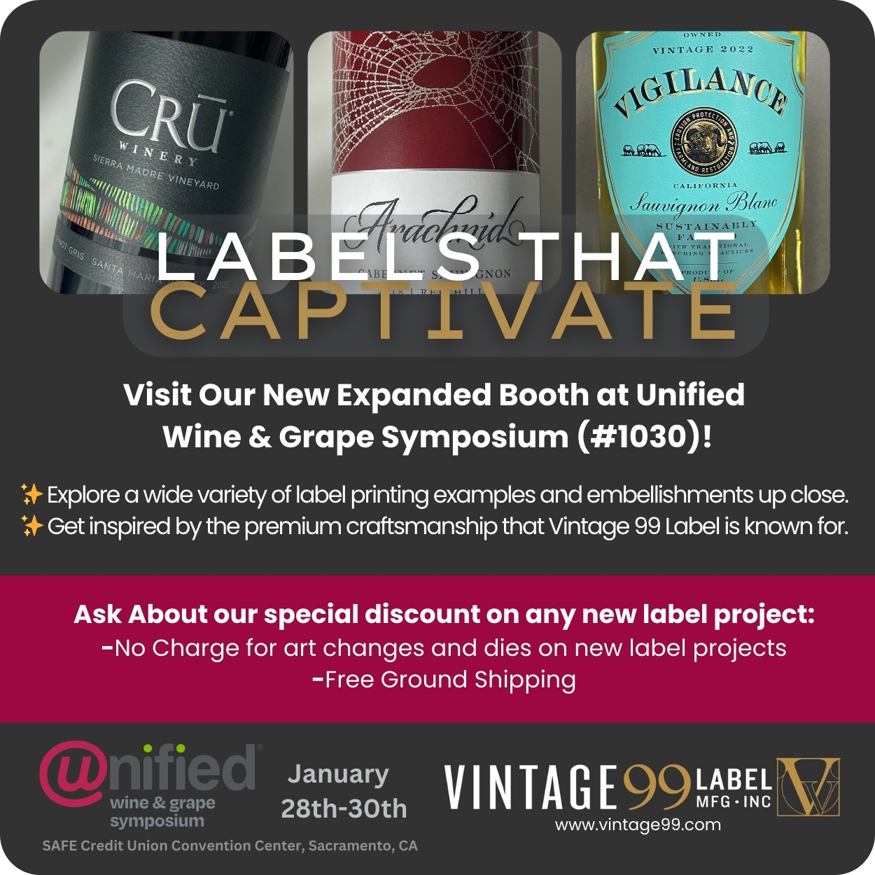 In celebration of the upcoming Wine Industry Expo on December 5th, we’re excited to offer an exclusive promotion for wineries looking to launch a new label or experience the Vintage 99 difference.