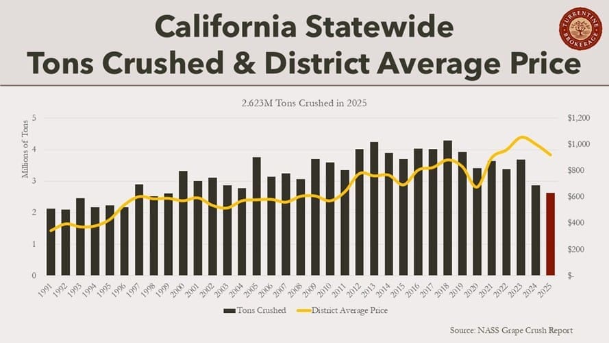 March 13, 2026 (Novato, CA) — Following the release of the Preliminary 2025 California Grape Crush Report, Turrentine Brokerage, the largest California grape and bulk wine brokerage company, has