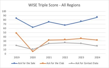 Hard to believe, we are a quarter of the way through 2025! It seems like just yesterday we were starting 2025, but here we are, 90 days in to the "new" year. Here are a few things you may have missed, things that caught our eye (or ear), and a few actionable ideas for the next quarter. 2024 Annual Report Card - WISE Mystery Shopping Triple Score In early 2025, we released our Annual Triple Score Report Card. While Mystery Shopping covers over 75 criteria points, these three are perhaps the most important. How often are our Mystery Shoppers asked buy wine, how often are they warmly invited to join the wine club, and how often are they asked to keep in touch via joining the mailing list? In 2024, we saw a dramatic decline in Triple Score averages. In particular, data collection is critically low at just 18%—meaning we’re only asking fewer than one in five guests to keep the conversation going. Wine clubs work because people DO like to be part of them (did you know